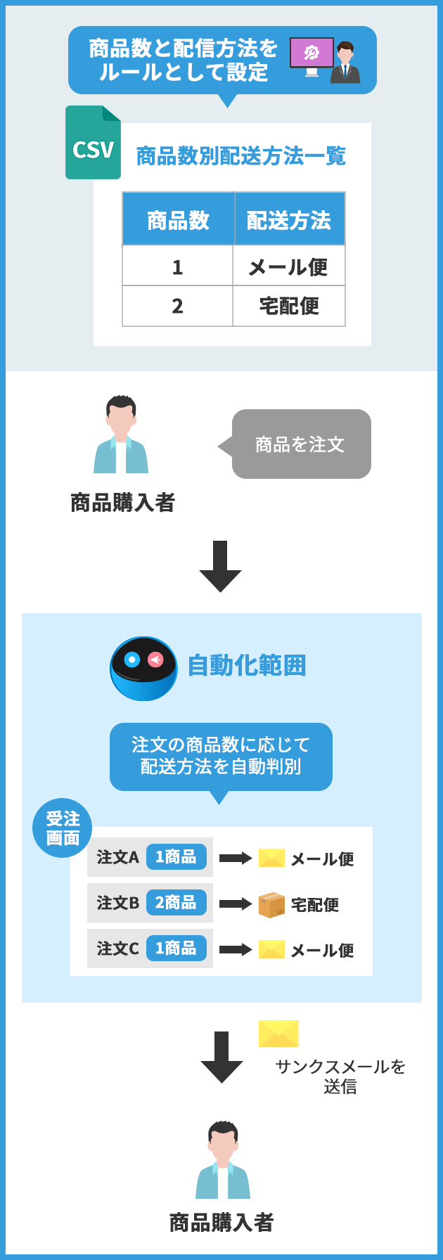 ①商品ごとの配送方法を自動で判別し、サンクスメールを送付